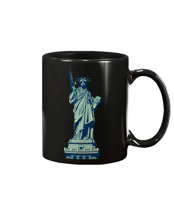 Every morning this mug reminds me that Lady Liberty's torch isn't enough without means to protect what it represents. The humor makes the point memorable without diminishing the serious principle. After a year of use it still looks perfect.