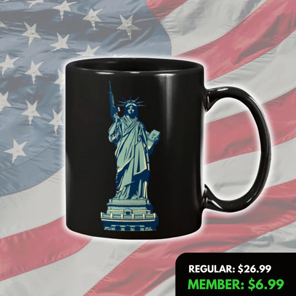 Morning coffee ritual combined with visual reinforcement that Lady Liberty's torch isn't enough without means to protect what it represents, keeping conviction strong that Second Amendment exists to defend First Amendment and all other freedoms—reminding you daily that liberty requires vigilance and willingness to fight.