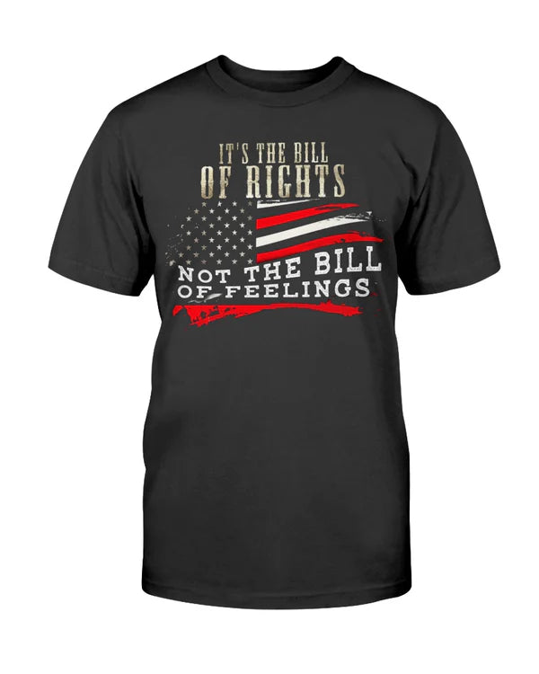 "Bill of Rights, Not Bill of Feelings" text clearly stating that constitutional protections exist for principles, not comfort, and that emotional reactions don't override established rights, so you're wearing direct constitutional advocacy—not diplomatic language that tries to soften the point—expressing what originalists and constitutionalists believe about unchanging amendments.