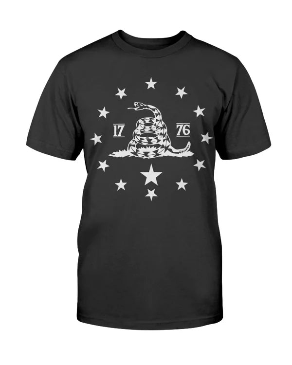 A timeless symbol of American grit and independence, this tee pays tribute to the spirit that sparked a revolution. Featuring the coiled rattlesnake and “1776” surrounded by thirteen stars, it’s a bold reminder that freedom isn’t granted—it’s defended. Made from soft, durable cotton, this shirt is perfect for patriots who stand tall, speak freely, and don’t take kindly to tyranny. Wear it proudly at the range, the rally, or wherever liberty calls.