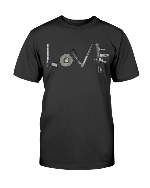 The LOVE letters are formed using firearm imagery—guns, rifles, or gun-related elements make up the letterforms. For gun owners and Second Amendment advocates, it's immediately recognizable clever design. For people unfamiliar with gun culture, they might just see stylized letters until they look closer. It's subtle enough to not be cartoonish but clear enough that gun enthusiasts instantly appreciate the wordplay. The message is: love comes in the form of defending what matters, and armed citizens loving their constitutional rights is how America stays free. It's humorous gun advocacy—saying you "love" firearms and the rights they represent. Works perfectly for people who appreciate creative Second Amendment expression.
