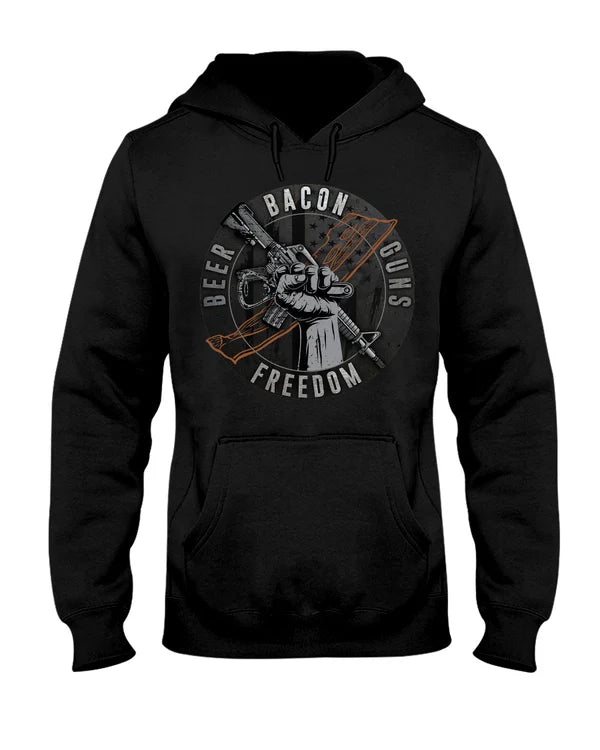 This is genuine celebration of traditional American male culture without apology. Beer, bacon, guns, and freedom represent real lifestyle elements many American men genuinely enjoy—not mockery or caricature. In rural areas, small towns, veteran communities, and gun-friendly regions, this resonates as authentic representation of values and activities people actually live. In progressive urban areas or among people who view these elements negatively, this might be read as stereotyping or toxic masculinity. This hoodie is for men (and women) who genuinely enjoy these things and don't care if others find them unsophisticated. If you actually grill bacon, drink beer with friends, shoot recreationally, and value freedom, this represents you. If you're worried about seeming backwards or offensive, this probably isn't for you.