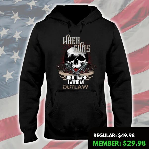 This hoodie doesn’t whisper—it growls. Featuring a skull-and-crossed-guns design with the message “When Guns Are Outlawed, I’ll Be an Outlaw,” it’s built for patriots who’d rather stand tall than bow down.