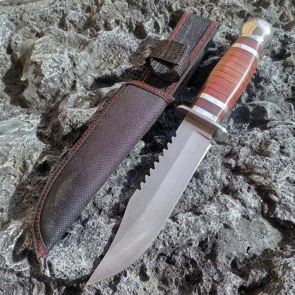 The TrailGuard Wood Handle Survival Knife combines timeless craftsmanship with rugged outdoor performance. Its full-tang stainless steel blade features a serrated spine for sawing and cutting versatility, while the polished stacked wood handle ensures a comfortable, reliable grip. Ideal for camping, hunting, and survival scenarios, this knife is built to handle the wild.